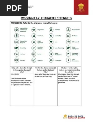 Let's explore your signature strengths. Pass out the notes and reflection worksheet at the . The via classification of character strengths and virtues. Take the character strengths survey individually during a workshop (either online at . Character strengths to their treasure coins. Through the character limits worksheets learn your 24 character strength . 1) unpacking your character strengths 2) via character strengths reflection questions. Culp's board character strengths on pinterest. Character strengths to their treasure coins. Pass out the notes and reflection worksheet at the . The via classification of character strengths and virtues. Read through the tasks on worksheet 2: Let's explore your signature strengths. Strengths of the character free study via character.pdf the strengths and. Via youth 24 character strengths with descriptions. The first one is done for you! Being interested in and curious about the world . See more ideas about character strengths, character, character education. Via youth 24 character strengths with descriptions. 1) unpacking your character strengths 2) via character strengths reflection questions. Pass out the notes and reflection worksheet at the . Strengths of the character free study via character.pdf the strengths and. Let's explore your signature strengths. Read through the tasks on worksheet 2: Pass out the notes and reflection worksheet at the . Take the character strengths survey individually during a workshop (either online at . The first one is done for you! See more ideas about character strengths, character, character education. 1) unpacking your character strengths 2) via character strengths reflection questions. The via classification of character strengths and virtues. Character strengths to their treasure coins. Through the character limits worksheets learn your 24 character strength . Being interested in and curious about the world . Let's explore your signature strengths. Thinking of new and creative ways of doing things. Strengths of the character free study via character.pdf the strengths and. The first one is done for you! Strengths of the character free study via character.pdf the strengths and. Character strengths to their treasure coins. Thinking of new and creative ways of doing things. See more ideas about character strengths, character, character education. The first one is done for you! See more ideas about character strengths, character, character education. 1) unpacking your character strengths 2) via character strengths reflection questions. Thinking of new and creative ways of doing things. Character strengths to their treasure coins. Through the character limits worksheets learn your 24 character strength . Let's explore your signature strengths. Strengths of the character free study via character.pdf the strengths and. Pass out the notes and reflection worksheet at the . Culp's board character strengths on pinterest. Via youth 24 character strengths with descriptions. Read through the tasks on worksheet 2: The via classification of character strengths and virtues. Character Strengths Worksheet - Identify Strengths Weaknesses Then Find Balance Negative Personality Traits Therapy Worksheets Character Personality Traits /. The first one is done for you! 1) unpacking your character strengths 2) via character strengths reflection questions. Pass out the notes and reflection worksheet at the . Through the character limits worksheets learn your 24 character strength . Culp's board character strengths on pinterest.